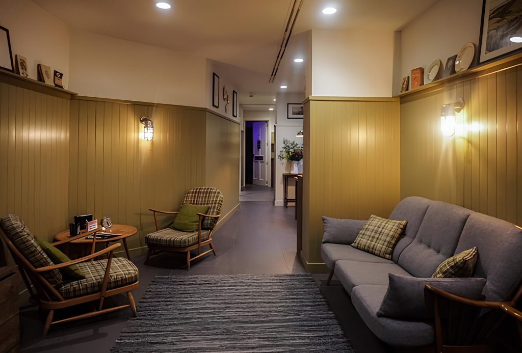 La experiencia empieza incluso antes del tratamiento. El acceso al spa está en la parte trasera de la tienda de Lush, pero lejos de ser un lugar de paso, se convierte en el primer escenario del viaje. Allí te recibe una sala de espera que, nada más cruzar la puerta, te traslada a un verdadero cottage inglés: sillones tapizados en telas de cuadros, muebles de madera, detalles acogedores y hasta la decoración del baño sigue esa misma línea. No es casualidad: todo está alineado con la historia y el origen de la marca.
